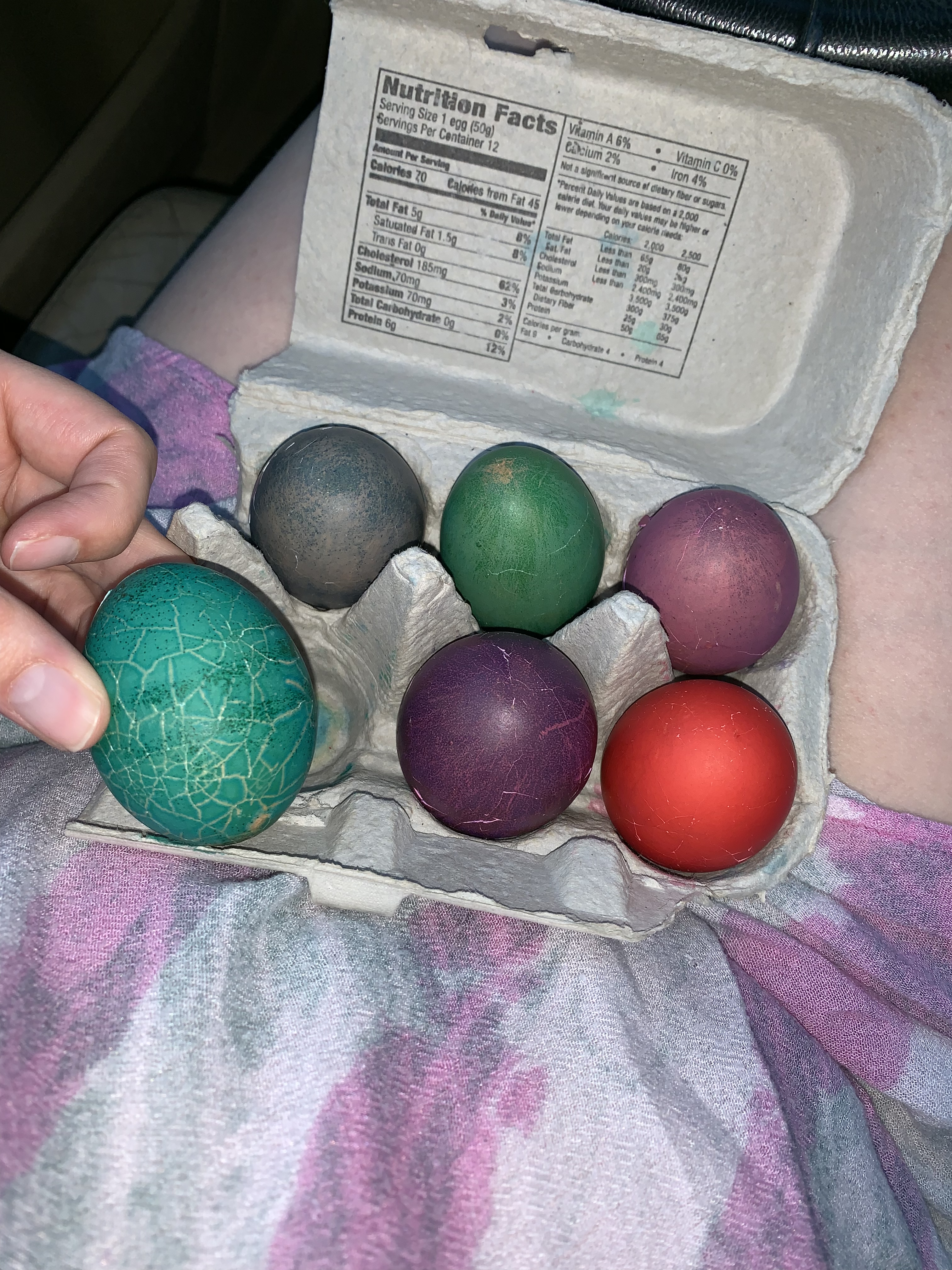 Because I made my eggs at an Easter egg dying party, I made my eggs with an Easter egg dye kit and let the gently cracked eggs soak in cups of dye-vinegar mixture instead of putting them in plastic bags of food coloring. Follow the Buzzfeed recipe; my eggs did not turn out well. While they might have looked cool with the shells on, only 2 of my eggs (the red one and the teal one I’m lifting in the picture) actually came out nicely, the rest all only had a couple spots of color or none at all.