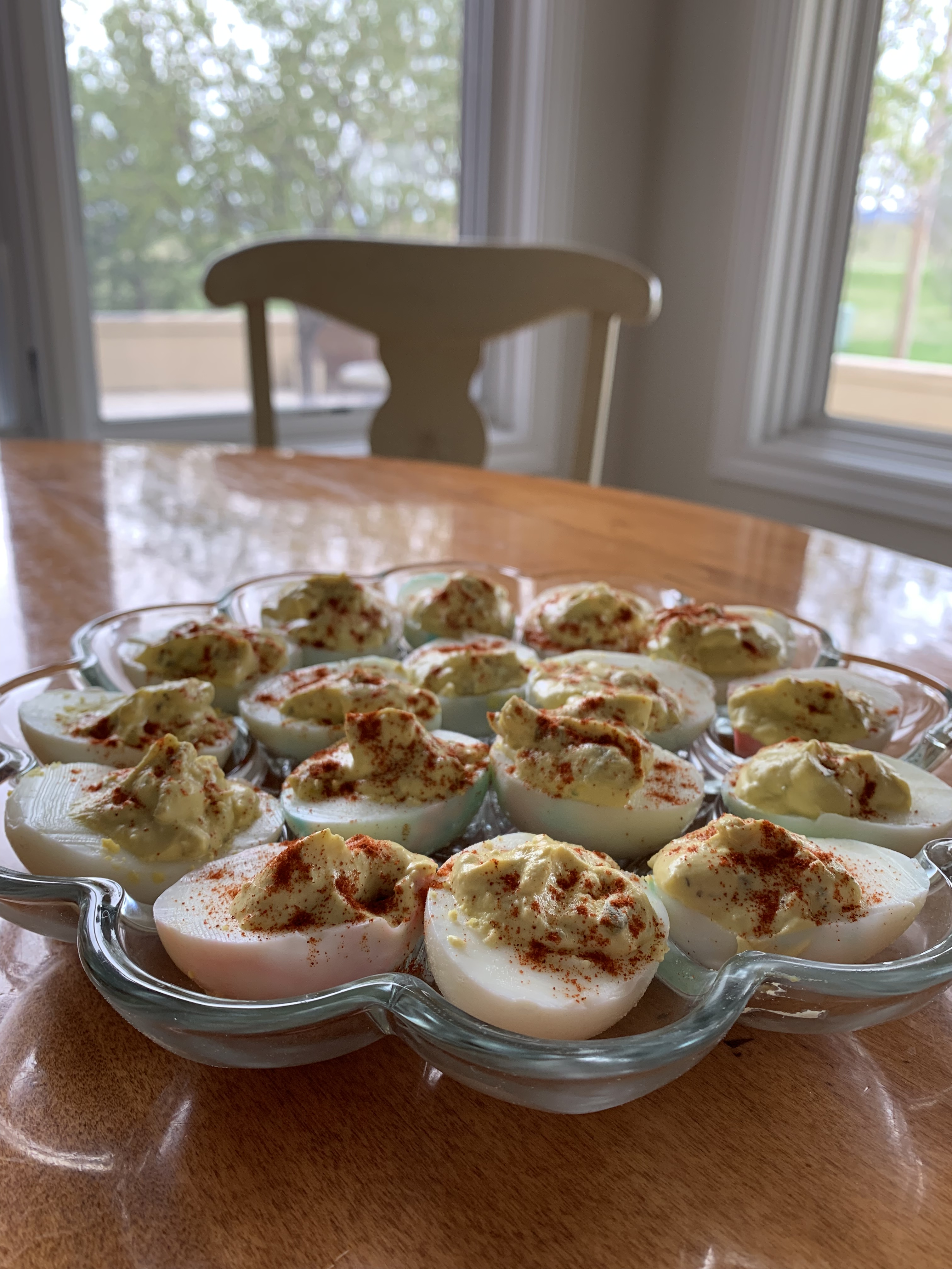For this recipe, I loosely followed the directions for a recipe I saw on Buzzfeed. The aesthetic in the recipe was so cool and I was dying to try it but didn’t think I’d have the opportunity because what college student has time to sit around dying eggs? (This was before I began this project). Well, luckily for me it was the week of Easter and a friend invited me over for an Easter egg dying party, and I used it as an opportunity to make the deviled dragon eggs I saw on Buzzfeed. It ended up being so much fun that it inspired this whole final project.