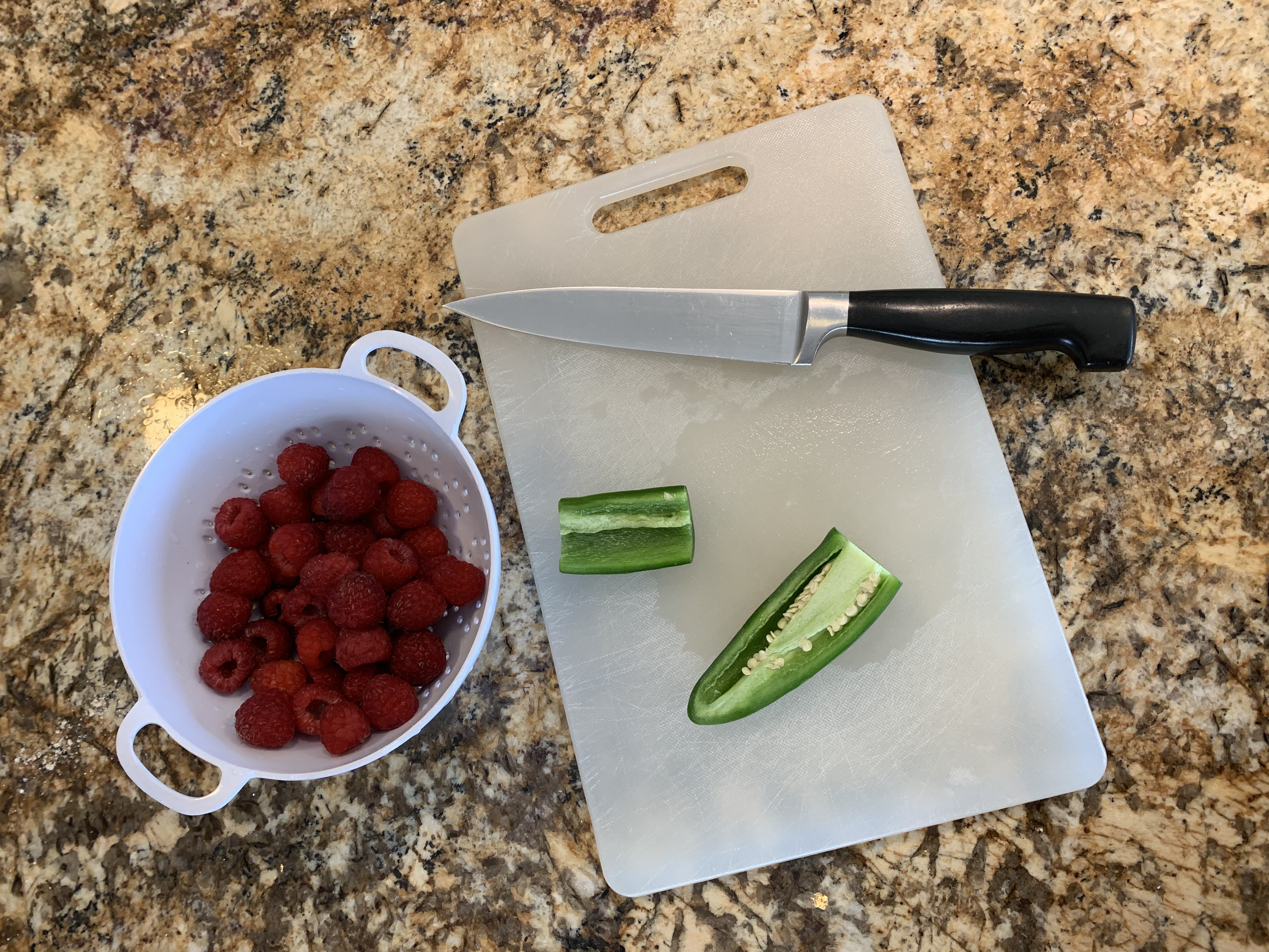 For the raspberry-jalapēno dip, roast the jalapēnos, de-skin, split in half, and remove seeds. Sauté garlic until browned. Put jalapēnos, garlic, raspberries, apple, and vinegar into food processor and process until smooth. Place processed mixture in pan with vinegar, honey, apple-cranberry juice, wine, and salt and bring to a boil, stirring constantly. Reduce heat to a low simmer until 1 half reduction, stirring occasionally. This last step will take about an hour.