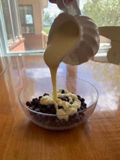 For the blueberries, I simply used store-bought frozen blueberries, although I suppose you could buy them fresh and freeze them overnight. The sweet cream sauce I used is a family recipe that we use to pour over berries, so it seemed appropriate that I would use it for this dish. This recipe includes uncooked egg yoke, skip this recipe if you’re worried about food-borne illness such as salmonella.
