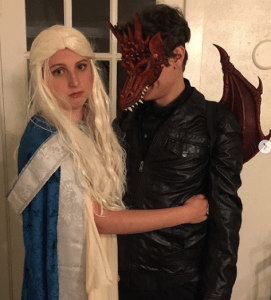Hey there! Welcome to the start of my fandom blog honoring Game of Thrones! As you can tell, I quite like Daenerys, Mother of Dragons. Enjoy these pictures of my fiancé and I from Halloween 2017. I really enjoyed riding around on my dragon’s back all night after my feet got tired, and also strangers bowing down to me, their Khaleesi. 10/10 experience, would do again. 🙂